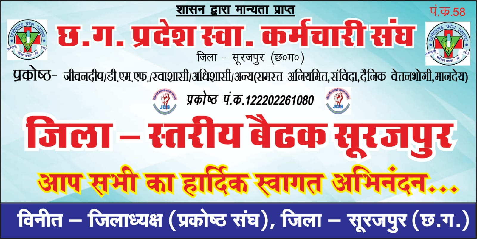जीवन दीप कर्मचारियों का जिला स्तरीय बैठक संपन्नछ.ग. प्रदेश स्वास्थ्य कर्मचारी संघ के बैनर तले प्रकोष्ठ संघ के जिलाध्यक्ष निलेश कुमार साहू के नेतृत्व में