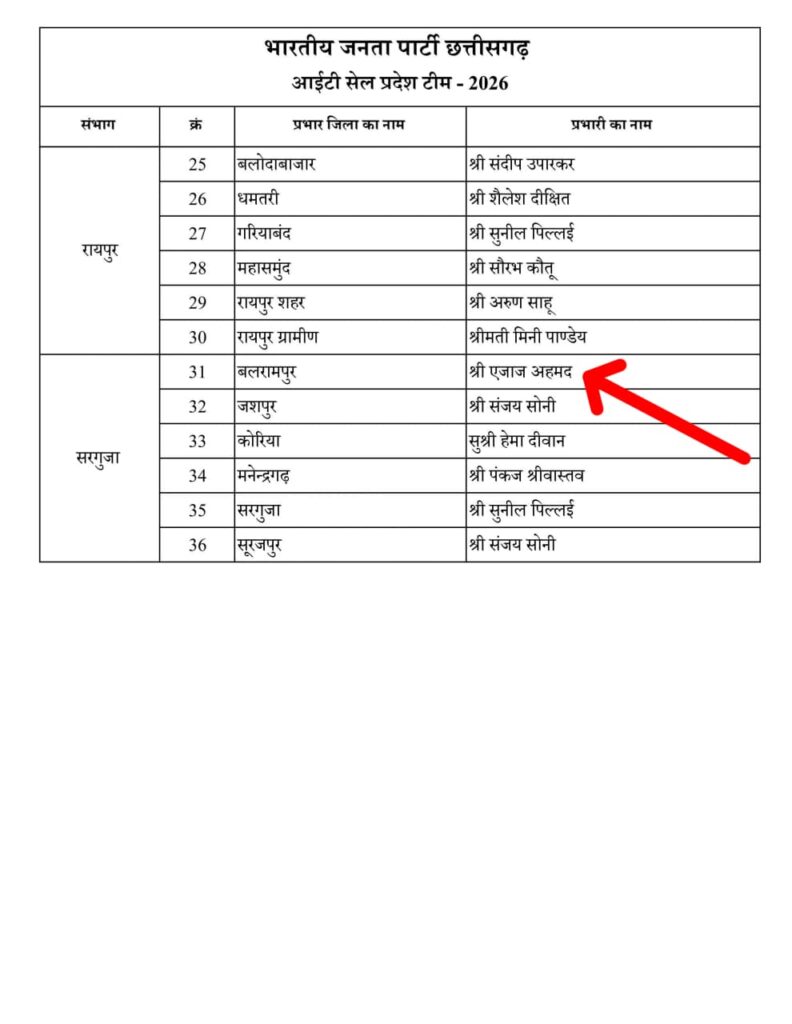 जिसमें प्रदेश संयोजक आई टी सेल सुनील पिल्लई के नेतृत्व में सूरजपुर जिले के एजाज अहमद उर्फ जिम्मी को बलरामपुर जिले का आई टी सेल प्रभारी बनाया गया है,,, गौरतलब है कि एजाज अहमद उर्फ जिम्मी पहले भी युवा मोर्चा सहित दो बार आई टी सेल के जिला संयोजक का पद संभाल चुके हैं,,,